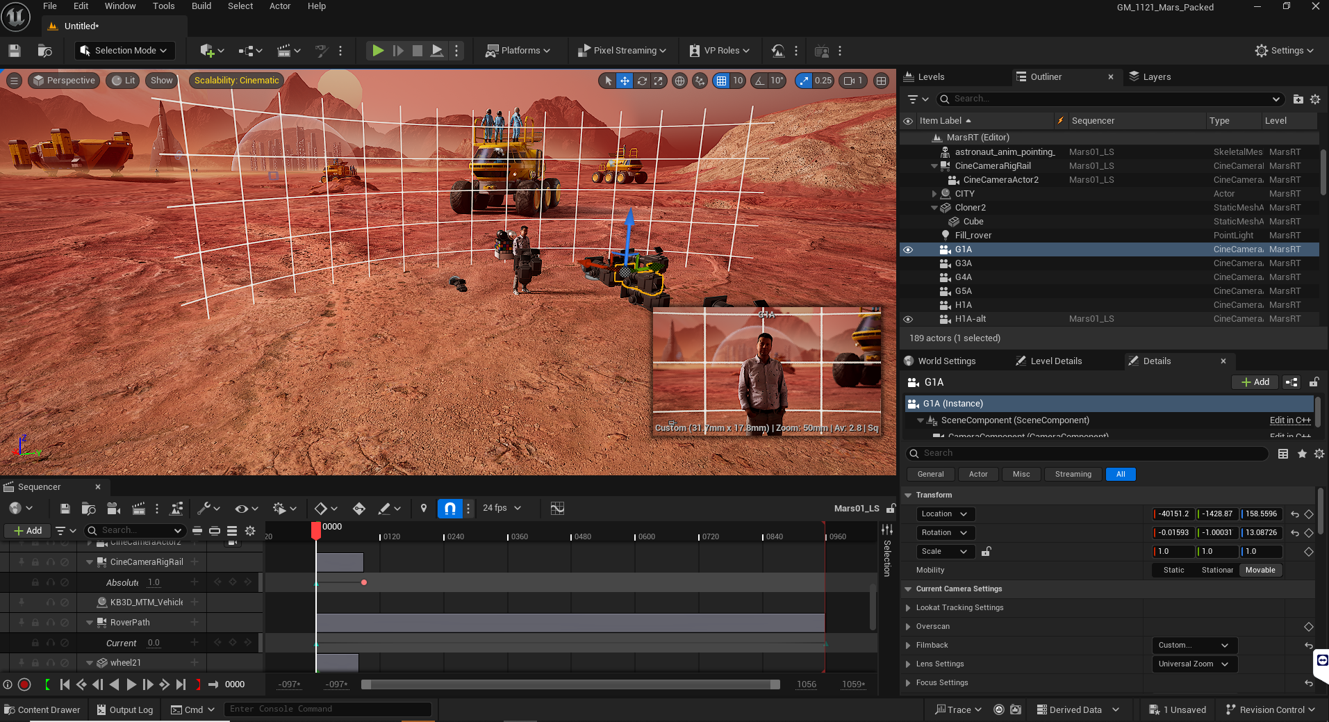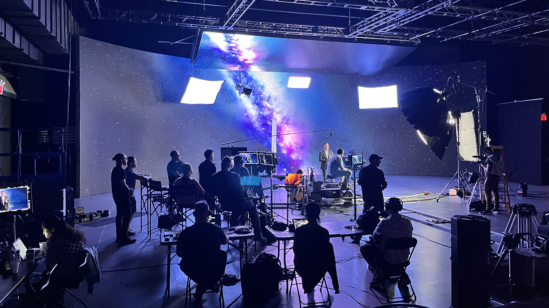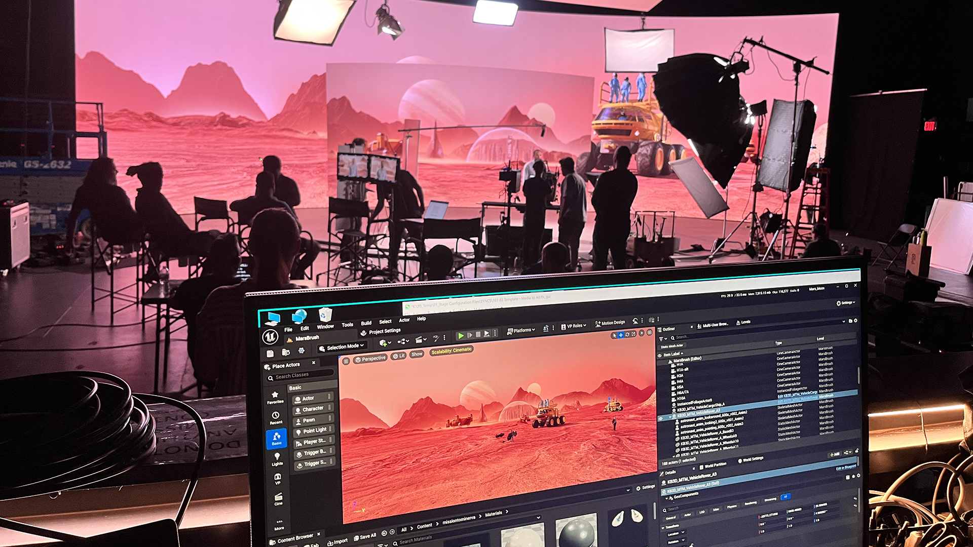 While we developed the environments, the Glass and Marker team were developing the story the video would tell and how they were wanting to present Gemini. We helped them flesh out the visuals by having virtual sessions with the director going through the script and adding cameras and actors to the environments with exact positions to establish the framing they wanted. This not only helped establish the story with the clients, but saved time on the set because the stage was able to set up approximate markers for where the cameras should be before the team was even there.